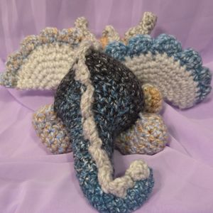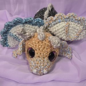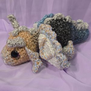 This adorable dragon is ready to find a loving home! Created with a soft acrylic blue and brown yarn and sparkly golden safety eyes, this snuggly plush is safe for ages 3+.