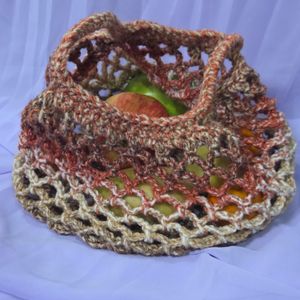 This reusable tote folds into itself for easy storage in a bag or car. Made completely of acrylic yarn, it is a sturdy mesh bag excellent for produce, small shopping trips, or even carrying essentials at the beach.